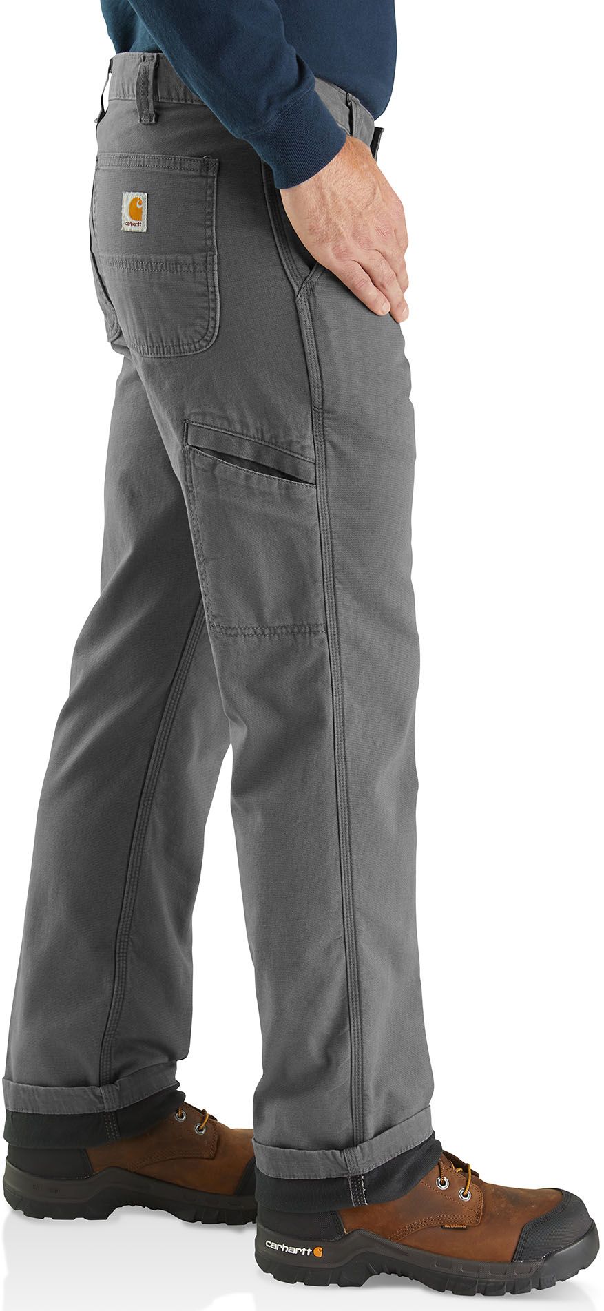 8 ounce 98 cotton 2 spandex canvas 2 3 ounce 100 polyester knit flannel lining built with rugged flex to bend and stretch with you as you move sits at the waist relaxed seat and thigh reinforced front slash pocket stronger sewn on seam belt loops right leg secured cell. Rugged flex garments must meet the carhartt s defined standards for stretch recovery and durability so when you put on a rugged flex garment you know it won t let you down. These relaxed fit dungarees are lined with a knit flannel for extra comfort and warmth. 100 polyester knit flannel for extra warmth.